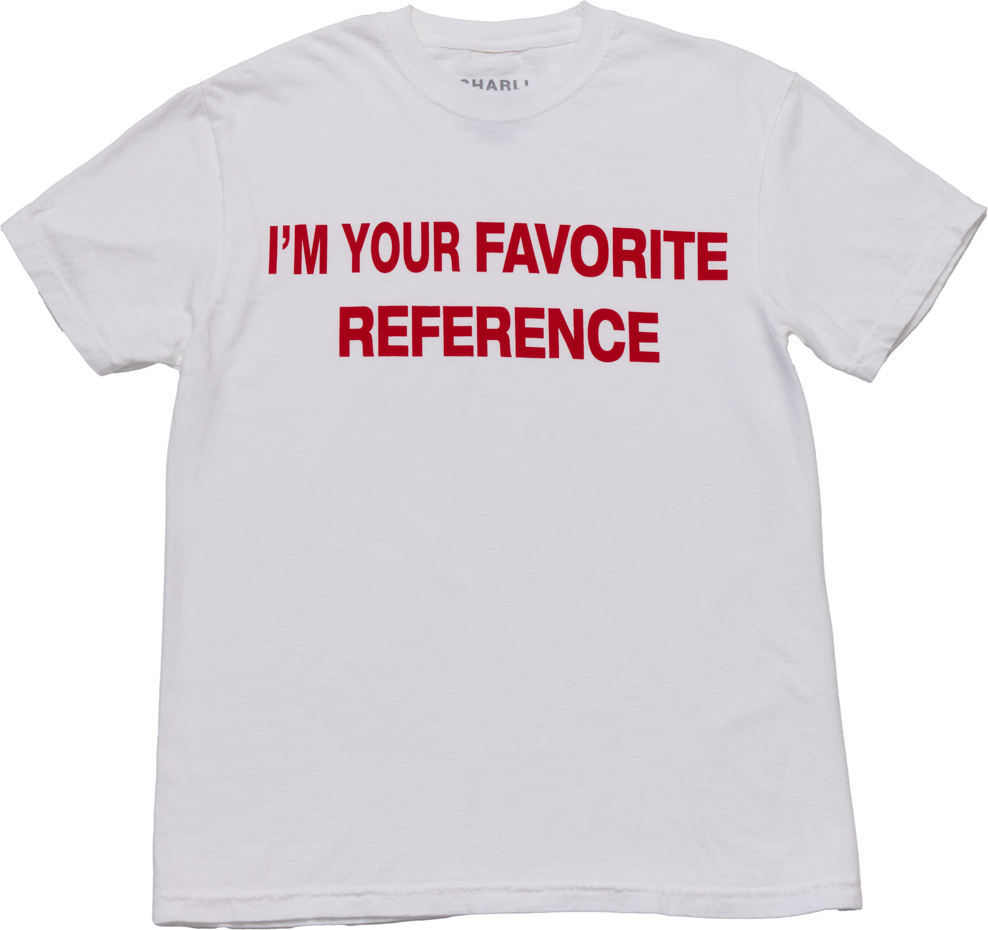 white short sleeve tee with printed "I'm your favorite reference" graphic on the front.